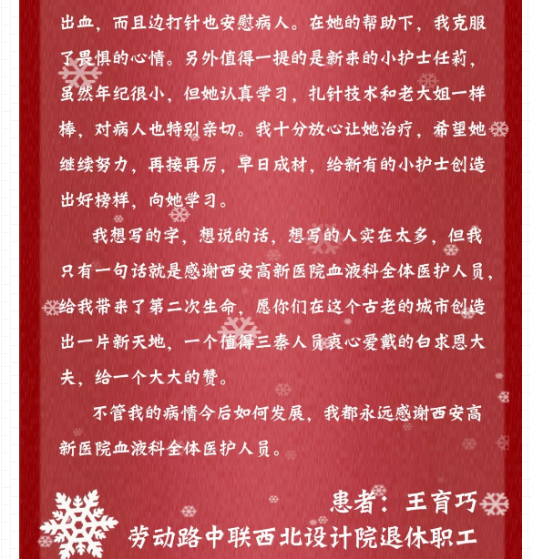 近期,beat365中文唯一官网学管工作群转发了一封“一位白血病患者的意外来信”,文章由西安高新医院订阅号发出。文章的主人公是位76岁高龄的白血病患者——王育巧。她在文章中讲述了西安高新医院血液科对她的尽心治疗,温馨护理,向该科室全体医护人员表示了感谢。文中特别提到了几位医护人员,其中就有我院实习生任莉。