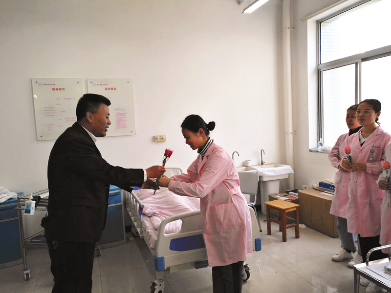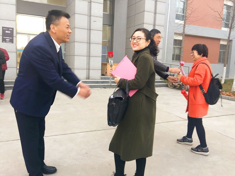 吴运胜书记、学生科副科长苏建军为女教师送上鲜花、祝福