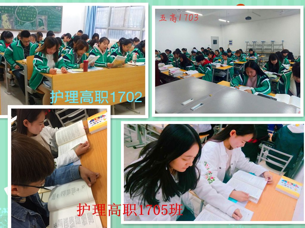本次活动由学生会文体部主办,以班级为单位开展。活动中,护理高职1702班、护理五高1703班同学着装整齐,朗读声音洪亮;护理高职1721班、1722班读书环境良好,晨读氛围浓厚;护理高职1705班有效利用班级读书角,读书效果良好。经过连续五天对班级学生的参与、读书声音、读书内容、读书环境等情况的检查、评比,最终评选了护理高职1710班等五个班级获得一等奖,护理高职1708班等十个班级获得二等奖,护理高职1701班等20个班级获得了三等奖。