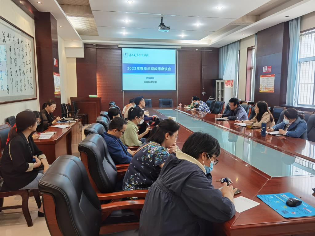 2022年4月27日下午,beat365中文唯一官网在医训南楼第一会议室召开了本学期教师座谈会。会议由教学副院长吴亚飞主持,院长张成、副书记李晓乾、教学科科长王媛及各教研室教师代表参加了会议。