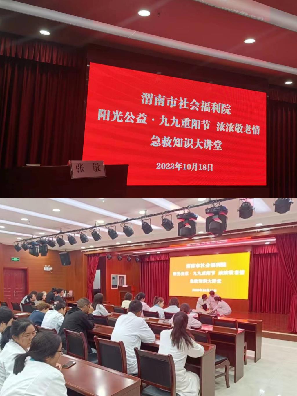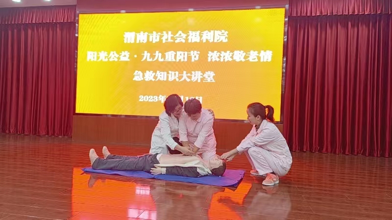 为弘扬敬老爱老的优良传统,丰富辖区老年人的精神文化生活,在九九重阳节来临之际,受渭南市社会福利院邀请,beat365beat365中文唯一官网教师张敏参加了“阳光公益·九九重阳节 浓浓敬老情急救知识”大讲堂活动,助力我院双高建设。她通过“心脏骤停的患者如何做心肺复苏?气道异物梗阻的患者如何救护?”等两部分为大家详细介绍了如何判断心脏骤停,心脏骤停后的胸外按压、开放气道、人工呼吸等方法及气道异物梗阻的原因、表现、海姆立克急救法的原理、操作方法等。为了让大家更好的掌握这些知识,让护理员切身体验操作的方法,张敏在现场给予详细、耐心的实操指导。