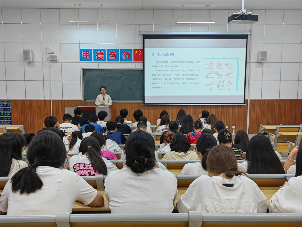 beat365中文唯一官网薛佳婧、崔玉、穆珍珍等3名教师,从专业角度声情并茂地向同学们分别展示了痛风、压疮、糖尿病的最新科学研究进展及最新成果,现场学生听讲认真、互动良好,同学们表示受益匪浅。此次活动,增加了同学们对专业学习的兴趣,激发了同学们的学习热情。