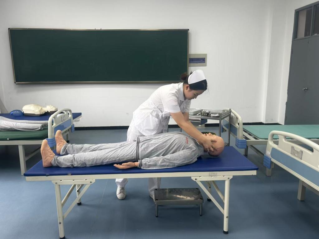课程围绕“心肺复苏(CPR)”与“意外伤害救护”两大核心主题展开。理论教学中,教师们通过动态流程图解、错误操作警示动画,将CPR的按压深度、频率等抽象标准转化为直观记忆点,现场互动问答不断。在实训环节,通过实训课堂直播与模拟教具联动,同学们分组轮番上手演练胸外按压、人工呼吸等核心技能,智能急救模型的电子屏同步显示按压力度波形图。