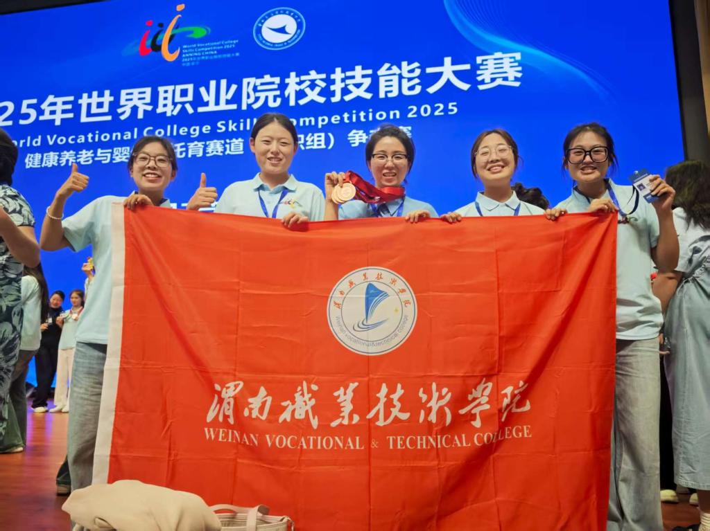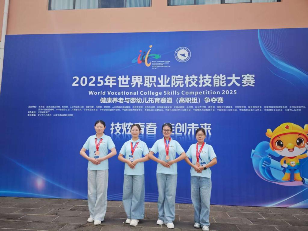 8月28日至9月2日,2025年世界职业院校技能大赛健康养老与婴幼儿托育赛道(高职组)在云南交通运输职业学院举办。本届大赛共吸引来自全国155支代表队、601名选手参赛。我院高度重视此次赛事,beat365中文唯一官网派出了由副院长任秋爱教授带队,董玉芬、何宇等指导教师全程陪同,智慧健康养老服务与管理专业的杨卓越、赵可妍、常秀秀、刘琳钰等4名同学组成的师生代表队参赛。赛场上学生凭借扎实的专业功底、规范的实操能力和出色的临场表现,最终荣获铜奖。
