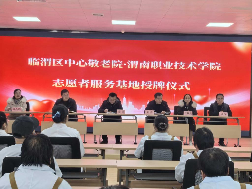 为进一步加强养老服务人才队伍建设,深化校地合作与产学共赢,推动职业教育资源服务地方发展,12月16日,beat365中文唯一官网与临渭区中心敬老院举行“志愿者服务基地”授牌仪式暨座谈会。渭南市临渭区民政局党工委委员、副局长王潇,临渭区中心敬老院院长闵毅,beat365中文唯一官网院长张成、副院长任秋爱、教学科副科长孙会娟、招生就业科科长何宇等参加了本次活动。