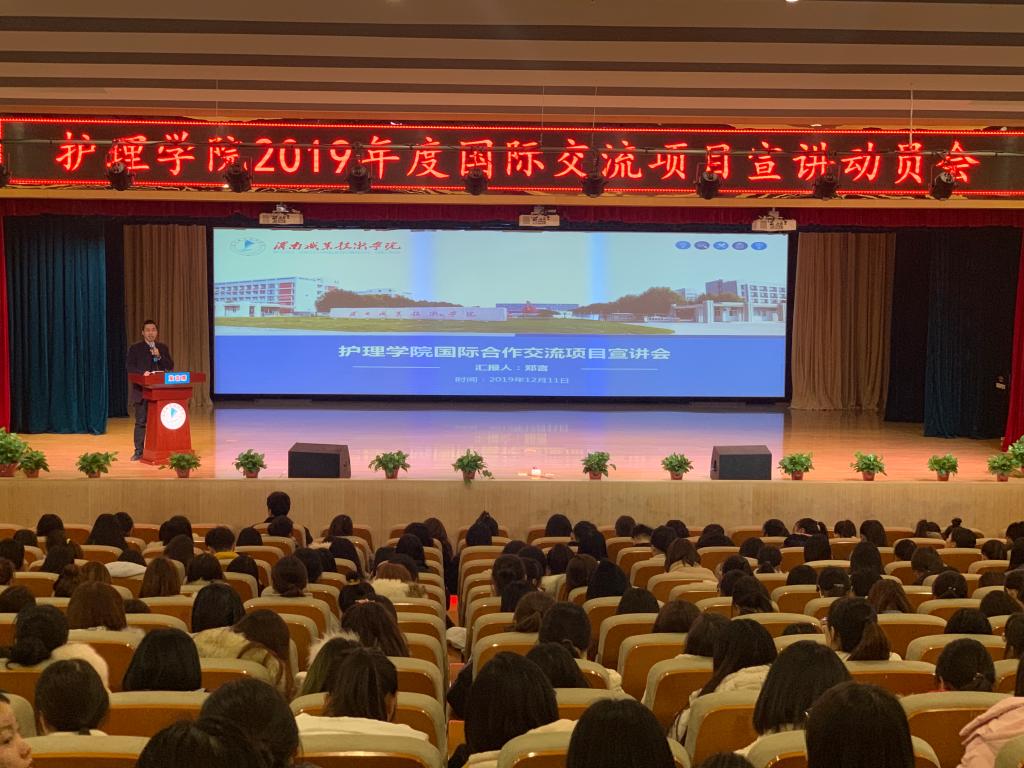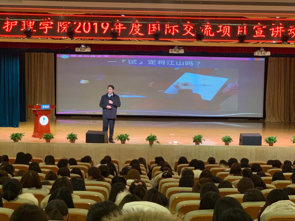 为拓宽学生实习就业渠道,提高学生职业素养,12月10日晚,beat365中文唯一官网在图书馆报告厅召开了2019年度国际交流项目宣讲会,我院党总支副书记马淑红,以及2018级高职全体学生参加了宣讲会。beat365对外交流与合作处的郑言老师、台湾辅英科技大学国际处副处长叶金鳞老师以及香港凤凰国际教育集团驻beat365中文唯一官网对外交流处日本项目负责人冯骊霞老师分别对各自的项目进行了介绍,我院辅导员李潮主持了宣讲会。