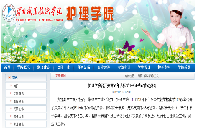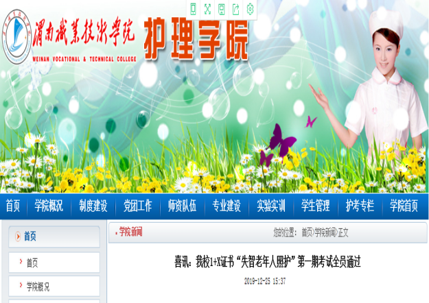 按照国务院印发的《国家职业教育改革实施方案》(职教20条)要求,围绕服务国家需要、市场需求,落实“放管服”改革,推进“1”和“X”的有机衔接,提升职业教育质量和学生就业能力,制订beat3651+X证书培训实施方案,并建立相关组织机构。积极对接北京中民福祉教育科技有限公司和济南阳光大姐服务有限责任公司,完成1+X证书师资培训6人次、考务考评员培训4人次、考务技术员培训2人次和检查督导员培训1人次。失智老年人照护成为陕西省唯一的试点院校和地市级考点。