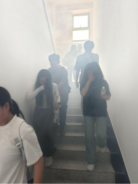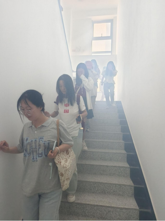 2024年6月12日,保卫处会同外国语学院开展了“增强消防安全意识、提升应急处置”消防安全培训及疏散演练,组织人员通过在楼层预设的着火点释放烟雾弹并触发火灾报警装置,听到警报声知行楼全体师生迅速、安全有序地向就近消防楼梯和楼外撤离。