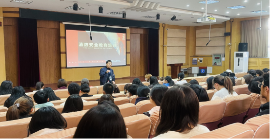 保卫处消防科杨俊康为新生们详细讲解了消防安全知识,包括火灾的预防、火灾种类以及不同灭火器的使用方法等,同时强调了火灾发生时保持冷静的重要性。