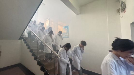 演练高度还原真实火情场景,所在楼宇全体师生严密捂住口鼻,保持弯腰低姿,沿就近消防楼梯,按照指定疏散路线,快速有序撤离至楼外安全区域。撤离后,工作人员立即清点人数,同步对“受伤人员”开展急救处置,并组织人员使用消防器材开展灭火,整个流程衔接紧密、分工明确。
