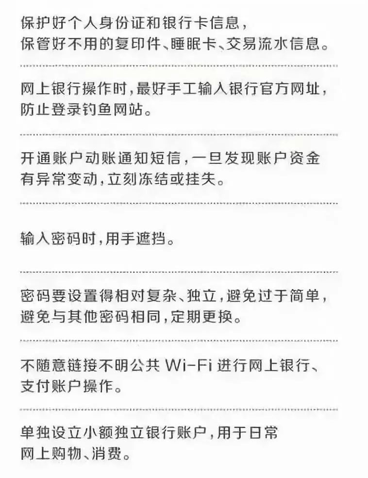 3、提高防范意识,不要轻易相信陌生电话(自称是公安局、检察院或者银行客服、网购客服等)告知自己的银行卡有问题而去按照提示进行转账,这多是诈骗;也不要贪小便宜,急功近利,因为天上不会掉馅饼。