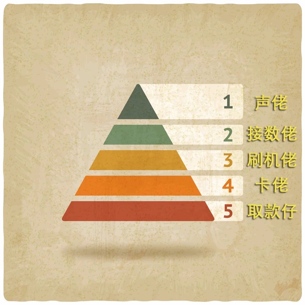 诈骗洗钱集团内部分工极其精细,一般分为五个层级。第一层称为“声佬”,专门负责打电话、发信息、邮寄等工作;第二层称为“接数佬”,负责连接“声佬”和下一层;第三层称为“刷机佬”,顾名思义就是负责刷POS机,把钱刷到网上结算中心去;第四层是“卡佬”,负责提供各种银行卡,分别自己转移;第五层就是“取款仔”,专门负责取钱,可以自己去取,也可以付费叫别人去取。