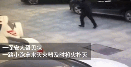 眼瞅着火情可能进一步发展,就在这时,附近一名保安大哥火速赶来,用灭火器将车顶上的火扑灭。