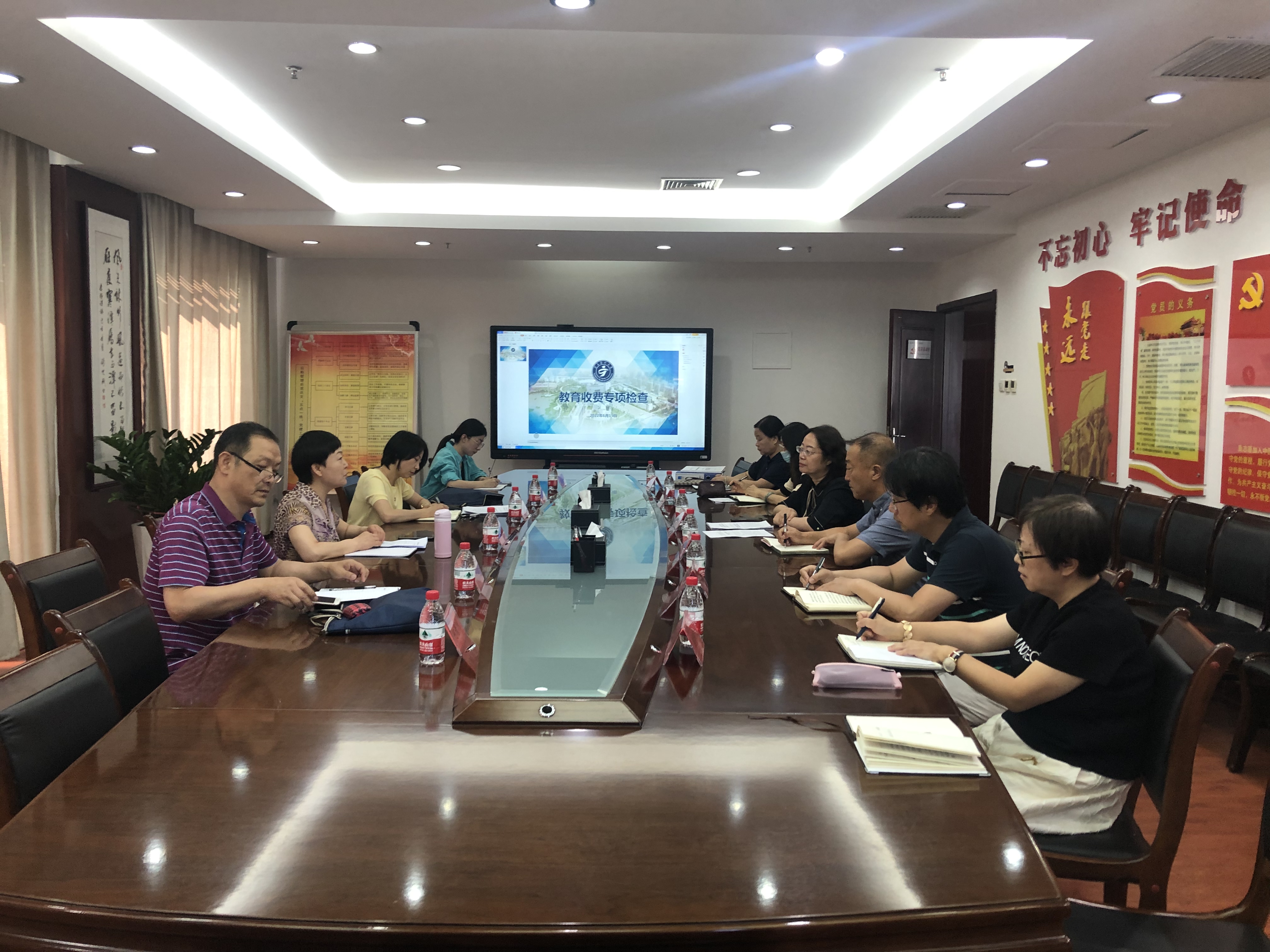 检查组举行了简短会议,检查组组长张红昱说明了本次教育收费检查的意义、目的和开展方式。副校长郝银菊代表学校对检查组一行来校指导工作表示欢迎,对主管部门长期的业务指导表示感谢。财务与审计处处长刘军明向检查组汇报了学校教育收费情况。