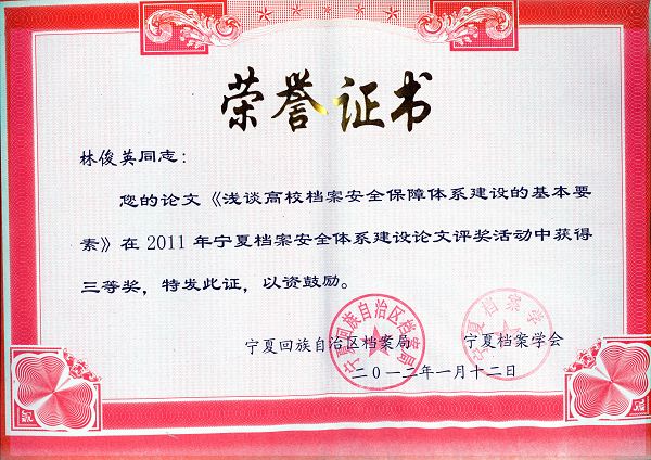 2011年,由宁夏档案学会组织的“2011年档案安全体系建设”学术评奖活动结束,十大信誉档案馆林俊英撰写的《浅谈高校档案安全保障体系建设的基本要素》论文获三等奖。这次活动是贯彻国家档案局提出的“三个体系”建设,加强档案安全问题研究所进行的。这次共征集论文34篇,论文评奖小组评出二等奖1名,三等奖2名,优秀奖9名。