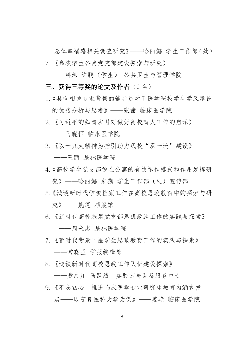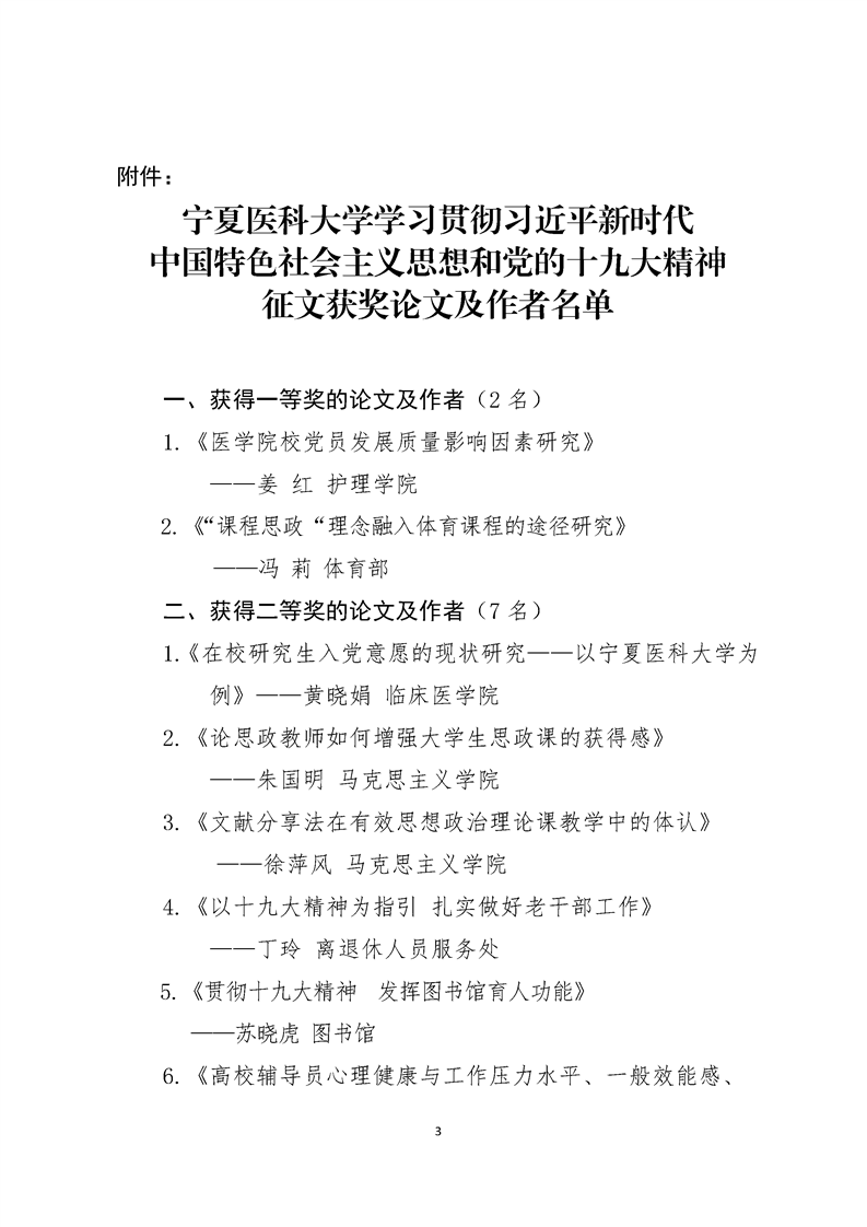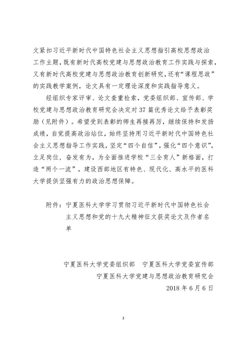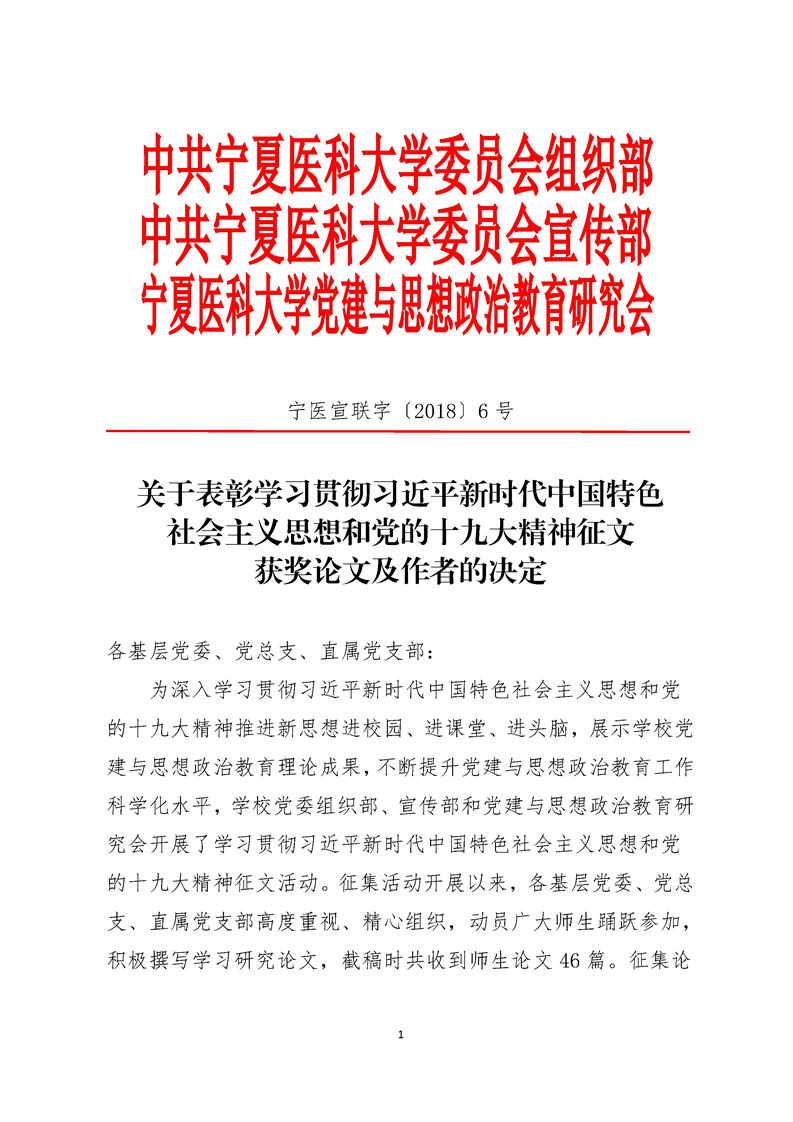 宁医宣联字〔2018〕6号 关于表彰学习贯彻习近平新时代中国特色社会主义思想和党的十九大精神征文获奖论文及作者的决定