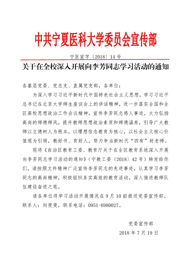 宁医宣字〔2018〕14号 关于在全校深入开展向李芳同志学习活动的通知