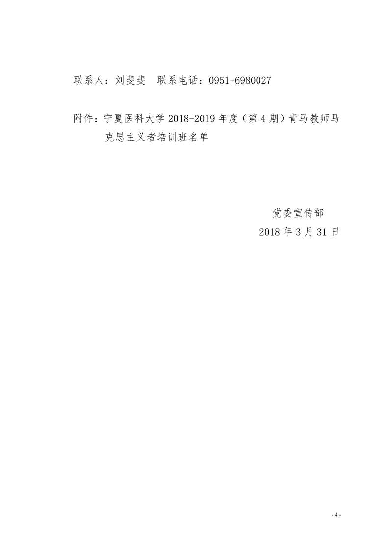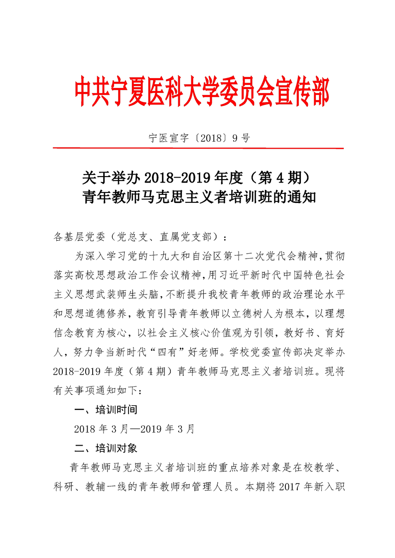 宁医宣字〔2018〕9号 关于举办2018-2019年度(第4期)青年教师马克思主义者培训班的通知