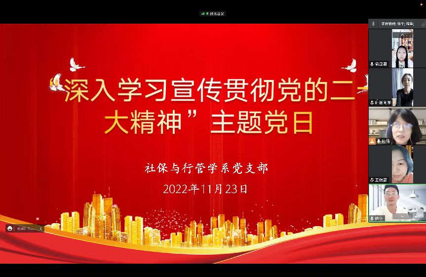 11月23日,公共卫生与管理学院社保与行管学系党支部通过线上会议开展“深入学习宣传贯彻党的二十大精神”主题党日活动。本次活动由学院社保与行管学系党支部书记程呈主持。