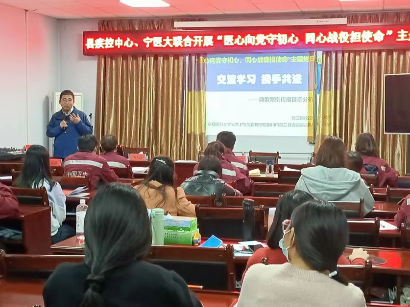公共卫生学院与管理学院院长张毓洪教授总结时讲到,党的二十大报告高屋建瓴、思想深邃、内涵丰富,闪耀着马克思主义的真理光芒,充分体现了中国共产党这个百年大党初心不改、矢志不渝的执着和坚定,彰显了习近平总书记作为大党大国领袖谋划复兴伟业、擘画强国蓝图的历史主动和使命担当。他表示,在当前宁夏的疫情防控形势下,驰援是我们义不容辞的责任,在过去一周多的交流和学习过程中,确实感受到了疾控人的艰辛和付出,这也对应急流调队的老师和同学们起到了鼓舞作用,作为新时代的党员教师和学生要接过历史的接力棒,弘扬伟大建党精神,提高党性修养,磨练自身本领,以此次支援活动为契机,进一步树立全员、全过程、全方位育人的理念。他希望,在以后的工作中,两个单位进一步加强交流和学习,从人才培养的角度,实现育人单位与用人单位的衔接,为“健康中国”的实现输送宁医力量。