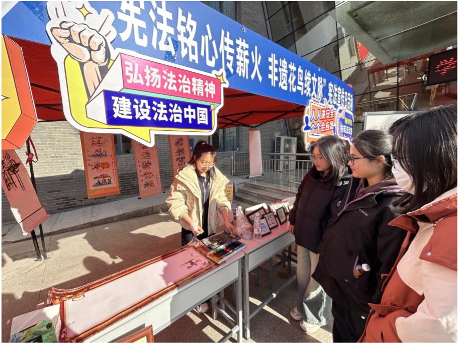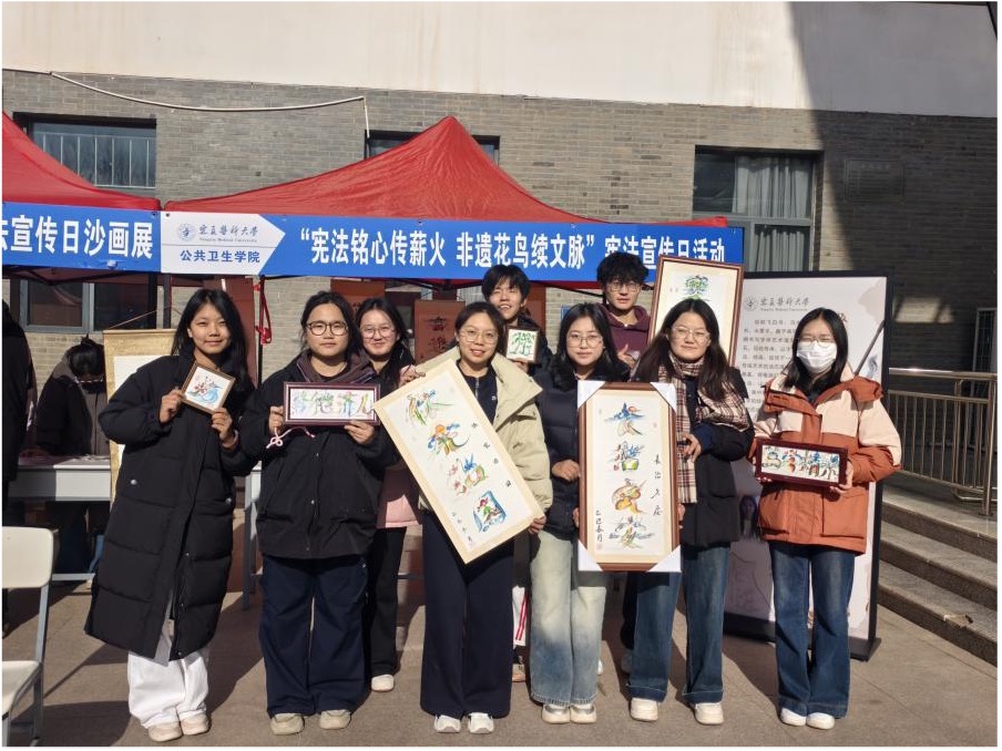 “宪法铭心传薪火,非遗花鸟续文脉”主题活动将宪法宣传与非物质文化遗产保护相结合,独具特色、意义深远。活动现场,板笔花鸟字第五代传人、学院2024级预防医学卓越班学生张迅闻现场示范花鸟绘画技艺,将宪法元素与花鸟艺术巧妙融合,创作非遗作品。一笔一画间,既展现了非遗文化的独特魅力,又传递了宪法精神的深刻内涵。此次活动以“宪法+非遗”的创新形式,让宪法宣传更接地气、更有温度,实现了法治教育与文化传承的双向赋能。