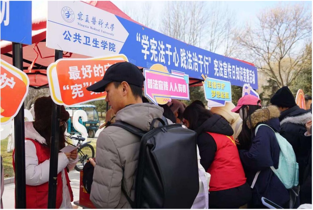 为深入学习贯彻习近平法治思想,党的二十届四中全会精神,大力弘扬宪法精神,增强全院师生的宪法意识和法治观念。12月4日,公共卫生学院在弘毅体育馆广场开展“12·4”国家宪法日宣传系列主题活动。全院师生踊跃参与,在沉浸式法治互动活动中感悟宪法权威。