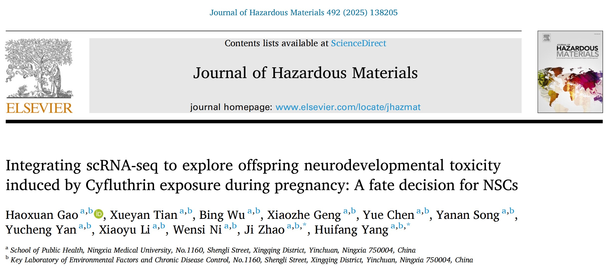 2025年4月7日,我院杨惠芳教授课题组在Journal of Hazardous Materials期刊(IF=12.2,中科院1区)发表了题为Integrating scRNA-seq to explore offspring neurodevelopmental toxicity induced by Cyfluthrin exposure during pregnancy: A fate decision for NSCs的研究论文,揭示了孕期氟氯氰菊酯暴露导致子代神经发育毒性的相关机制,为生命早期的神经发育障碍防治提供了有效新策略。