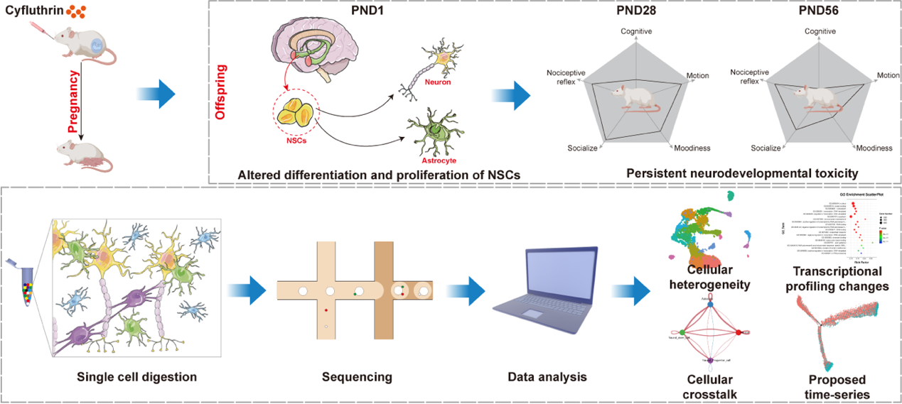 随着农药的广泛使用,孕期女性接触农药对后代健康的潜在危害受到了广泛关注。氟氯氰菊酯(Cyfluthrin)是一种常见的拟除虫菊酯类杀虫剂,该团队既往的研究提示其孕期暴露可能与后代神经行为异常相关,但具体的毒性机制尚未明确,因此本研究也是前期研究的延续和深入。本研究通过结合体内外实验与单细胞测序技术,系统解析了孕期Cyfluthrin暴露对后代神经发育的毒性机制。研究结果显示,孕期Cyfluthrin暴露的后代表现出持续性认知障碍,伴随海马区神经元丢失和突触损伤等神经缺陷。团队采用新生大鼠海马组织进行单细胞转录组测序,结合差异基因分析、细胞间通讯网络重建和拟时序轨迹推演,发现其致损机制可能源于生命早期神经干细胞(NSCs)的命运改变,即NSCs向神经元和星形胶质细胞分化的失衡,以及其增殖与凋亡水平的改变。上述关键机制已通过体内外实验得到验证。本研究首次构建了孕期Cyfluthrin暴露的后代海马单细胞图谱,揭示了NSCs命运改变在发育毒性中的核心作用。该成果不仅为孕期及哺乳期女性避免农药暴露提供了直接的科学依据,也为探索其他环境污染物(如重金属、塑化剂)引发的早期神经发育毒性提供了单细胞分辨率下的研究范式。