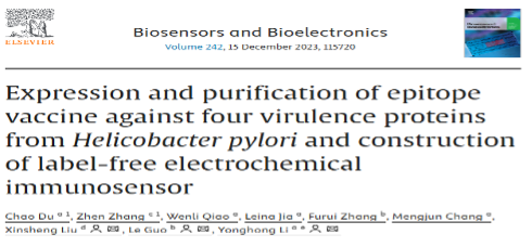 2023年12月15日,我院李永红课题组在Biosensors and Bioelectronics期刊(IF=10.7,中科院1区)发表了题为Expression and purification of epitope vaccine against four virulence proteins from Helicobacter pylori and construction of label-freeelectrochemical immunosensor的研究论文,构建的无标记电化学免疫传感器能同时识别H. pylori的四种毒力因子,对H. pylori抗体检测灵敏度高,可用于人血清样本分析,在H. pylori感染相关疾病的早期诊断和预后方面有一定的应用前景。