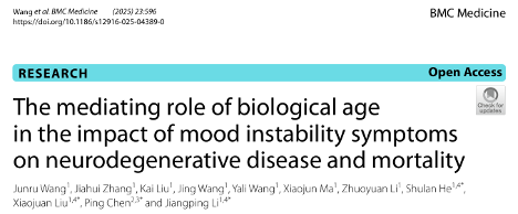 2025年10月30日,公共卫生学院李江平教授课题组在BMC Medicine期刊(IF=8.3,中科院1区TOP)发表了题为 “The mediating role of biological age in the impact of mood instability symptoms on neurodegenerative disease and mortality” 的研究论文,揭示了情绪不稳定症状与神经退行性疾病风险之间的关联,证实了生物衰老的中介作用,为早期识别和干预高风险人群提供了科学依据。