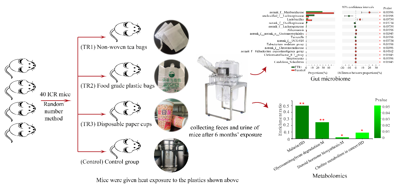 在这项研究中,采用ICR小鼠建立了三种常见塑料制品(包括无纺布茶袋、食品级塑料袋和一次性纸杯)的慢性饮水暴露模型。研究发现,三个模型组肠道微生物群的多样性和组成在属水平上发生了变化。代谢组学结果显示了代谢物数量的变化以及与炎症反应和免疫功能相关的代谢途径的富集。在组织学和生化检查中同样发现了炎症反应。因此,长期暴露于塑料制品热分解下的浸出液可能对肠道微生物组和代谢组产生影响,可能进一步造成健康损伤,为塑料潜在健康损伤的探索提供了新思路。