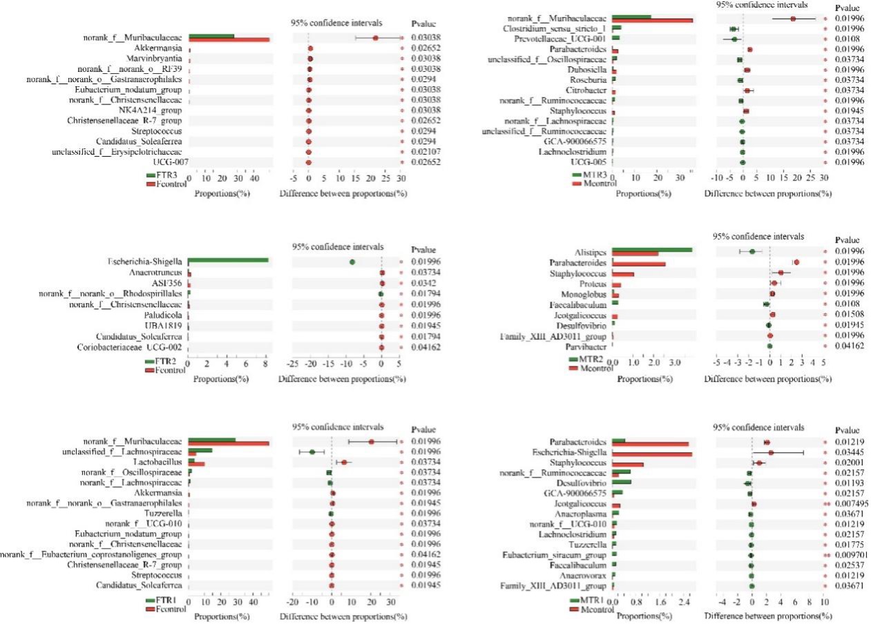 各组小鼠肠道微生物群在属水平上存在显着差异(图1):无纺布茶包组Lactobacillus、Parabacteroides、Escherichia-shigella和Staphylococcus丰度的降低和Lachnospiraceae丰度的增加;食品级塑料袋组Escherichia-shigella和Alistipes 增加,而Parabacteroides减少;一次性纸杯组 Muribaculaceae 减少。与对照组相比,暴露组的代谢通路富集情况如下图2所示,主要的富集通路与反映炎症反应、免疫功能和氧化应激的氨基酸、脂质代谢密切相关。