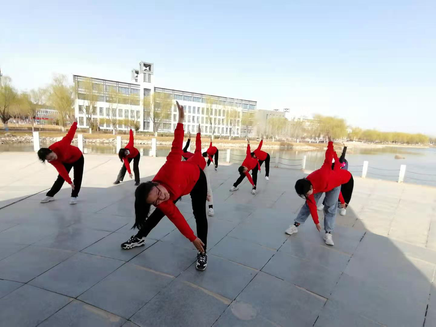 下午四点,活动在美丽的雁栖湖边准时开始。在动感的音乐中,分工会主席首先给女教工送上诚挚的节日祝福,之后带领大家学习有氧健身操。本次活动选择的有氧健身操动作简单易学,以瘦身效果好而著称,是风靡全国的健身舞蹈。在明媚的春光里,大家尽情挥洒汗水,享受属于自己的节日,欢声笑语洒遍雁湖。