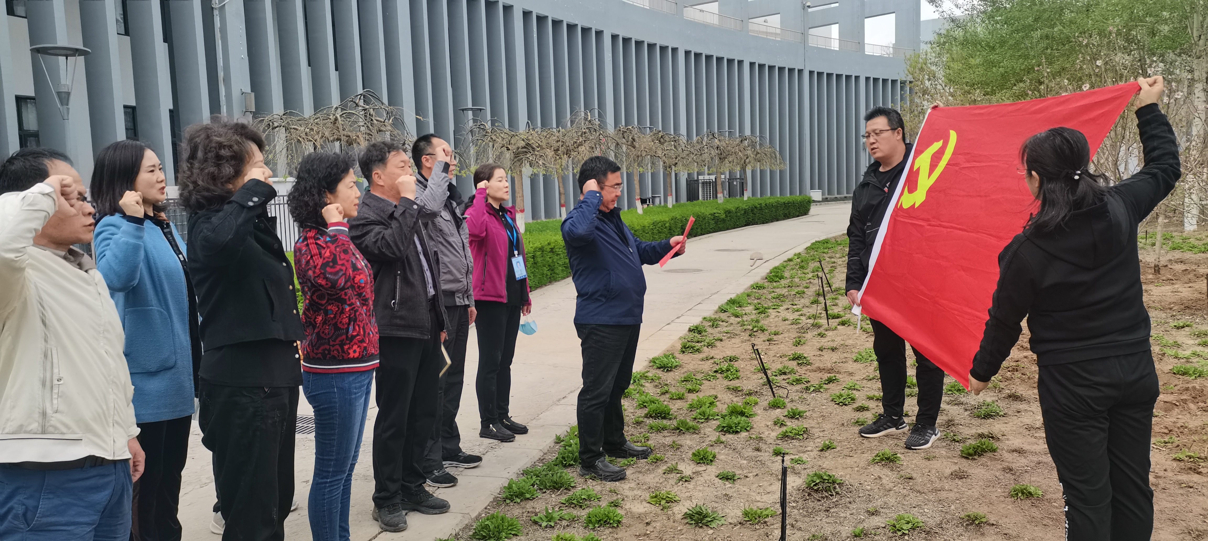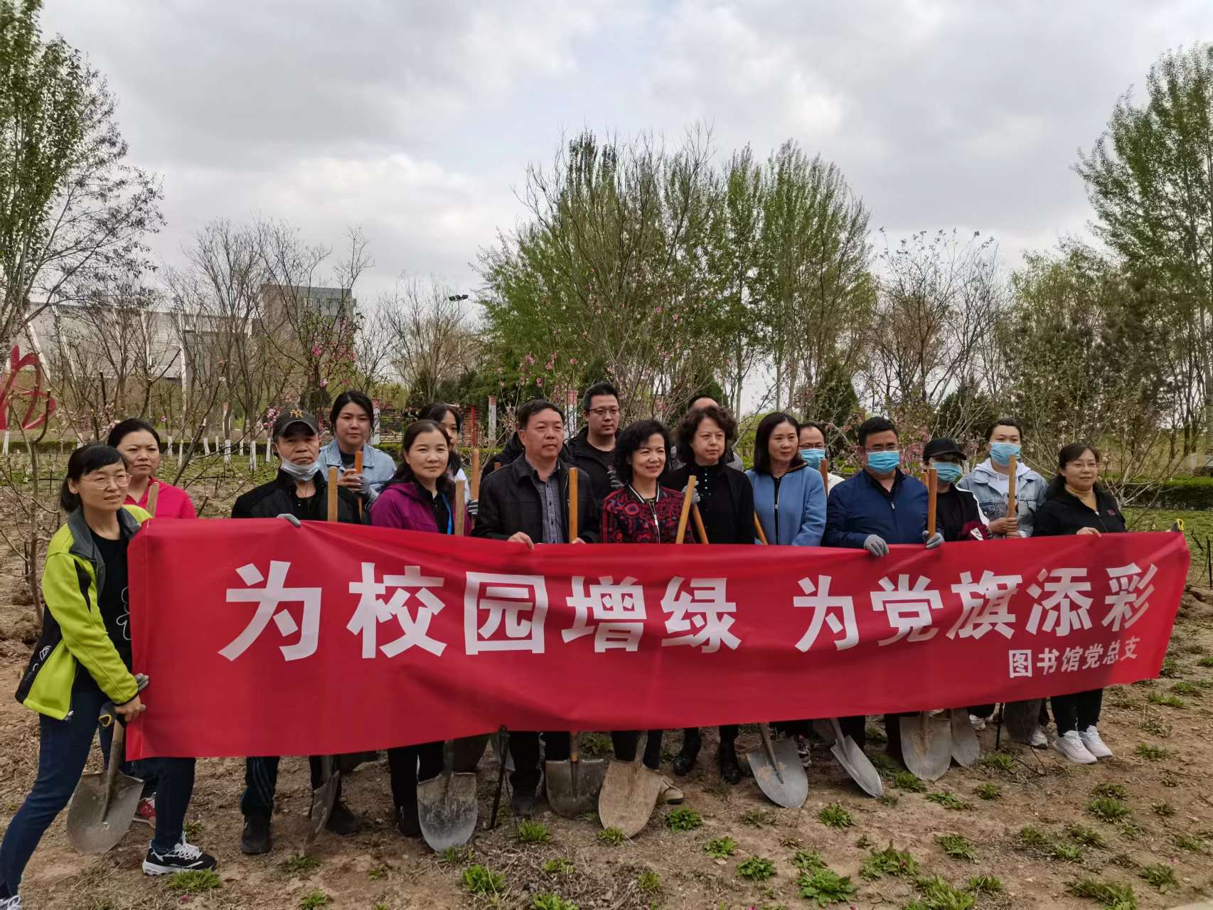 4月14日下午, 图书馆党总支、分工会组织全体教职工在学校弘毅体育馆东侧开展了“为校园增绿 为党旗添彩”主题党日活动,刘志宏副校长作为联系图书馆教工党支部校领导参加了此次活动。