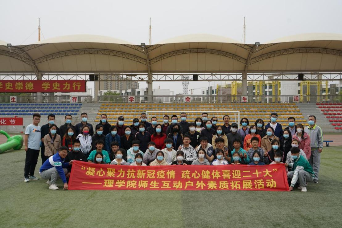 为在疫情封校期间疏导师生心理压力、构建心理健康,鼓励师生积极参加体育锻炼提高身体素质,进一步提高师生向心力凝聚力,坚定师生团结一心、抗击疫情的必胜信念,以更加饱满的精神面貌迎接党的二十大胜利召开,4月13日下午,理学院分工会组织全体教职工和学生代表在雁湖校区操场开展“凝心聚力抗新冠疫情 疏心健体喜迎二十大”师生互动户外素质拓展活动。