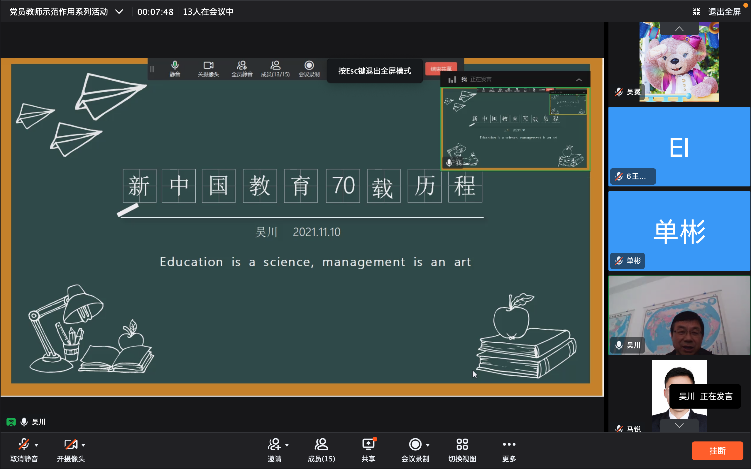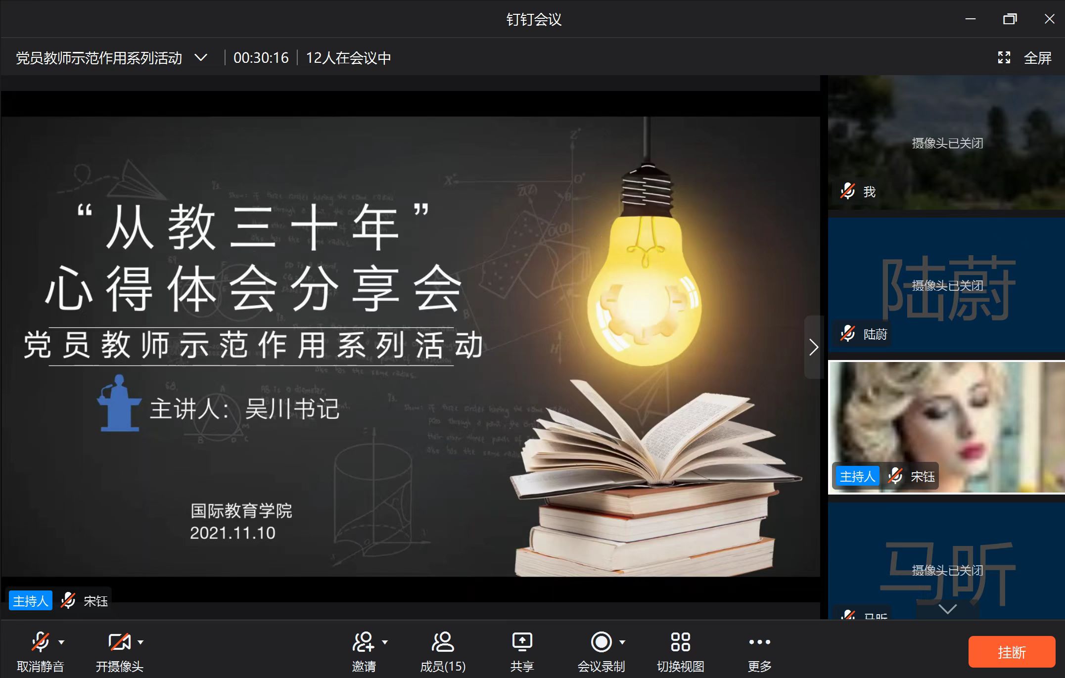 时光荏苒,岁月如歌,从教30年是教师生涯的一个光荣里程碑。11月10日,国际教育学院举行党员教师示范作用系列活动之从教30年心得体会分享会,邀请吴川书记分享从教感悟,全体教师参加此次在线会议。
