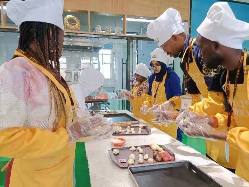 在宁夏A里蛋糕厂,留学生们跟着面点师傅学习制作苏式月饼。留学生们个个摩拳擦掌,看着桌面上的食材、工具,有的揉面团,有的压皮,有的包馅子,有的压模具,一会儿功夫,一块块独特并充满爱意的月饼就完成了。在等待月饼烤制期间,留学生们带来应景的节目。saad生动活的讲解,让留学生们了解了中秋节的传统和习俗。Omar深情朗诵的宋词《水调歌头·明月几时有》,让留学生们领略了宋词的美好意境。Joanna和 Jonnea带来了舞台剧《后羿和嫦娥》,让留学生身临其境的感受到中秋的传奇故事。还有其他留学生们带来的歌曲演唱节目,每个人都沉浸在欢快的氛围里。