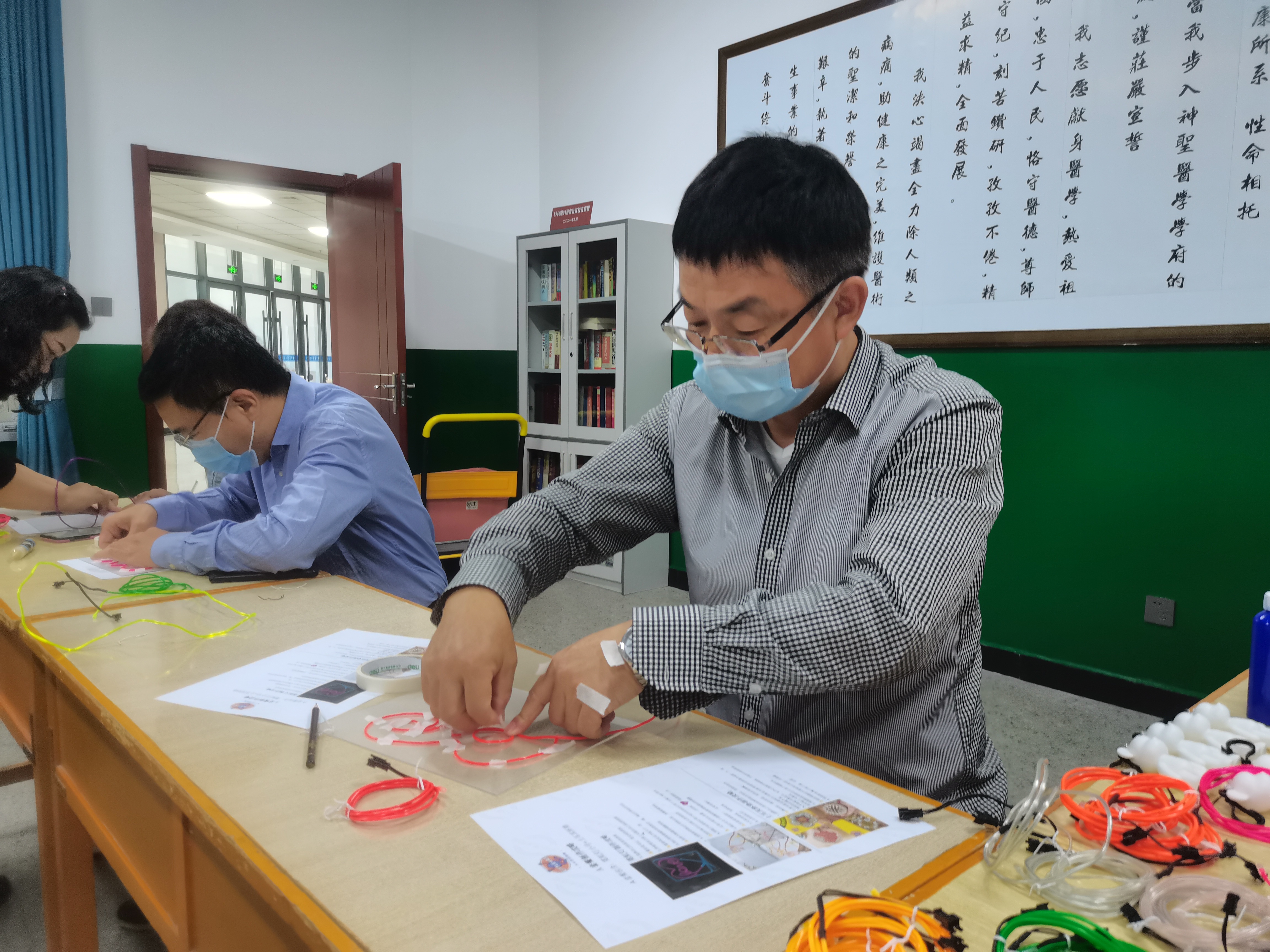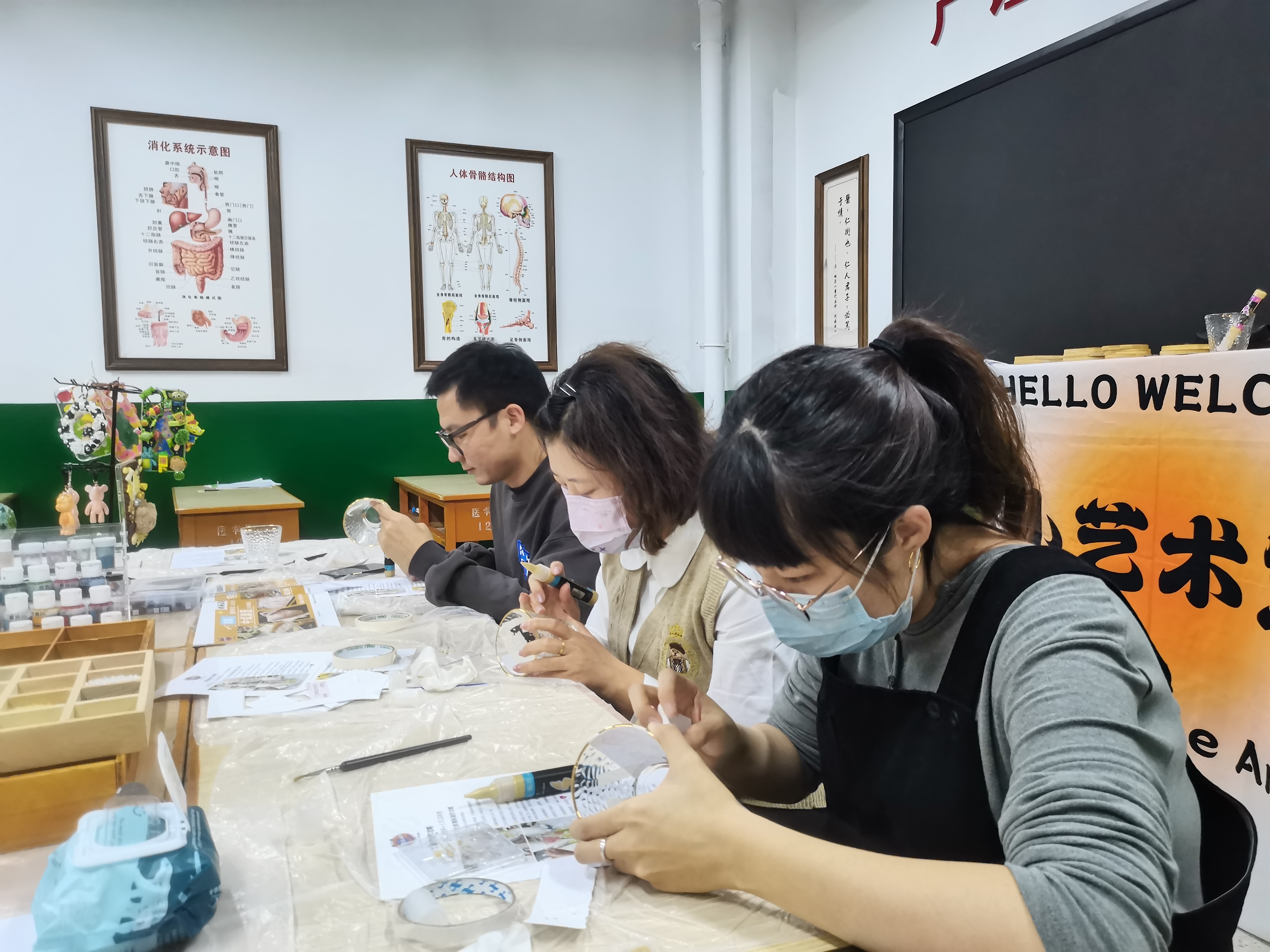 在制作活动中,学院教师在手工老师的指导下,开展了玻璃杯画、小霓虹灯、杯垫等的制作。老师们发挥自己的艺术潜能,或执起画笔在玻璃杯上创作图案,或用彩色灯线设计出自己喜欢的光电作品,活动内容都融入教师们的奇思妙想,让大家都沉浸在创作的快乐中。