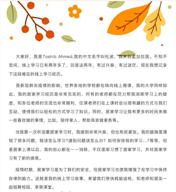 2020年新冠肺炎疫情席卷全球,留学生们的学习方式也发生了前所未有的变化,“线上学习”成为了留学生的学习常态。“停课不停教,停课不停学。”老师们和留学生们通过线上教学相知相伴已近三年的时间。虽然校园的样子可能已经模糊,但留学生们对学校的情感从未变淡;虽然少了老师们面对面的叮咛,但留学生们的自我学习能力越来越强;虽然不能进入实验室动手实践,但留学生们对知识的渴求日益强烈。线上教学带给留学生们这段特别的学习经历,让每一位留学生都有所收获、有所成长。