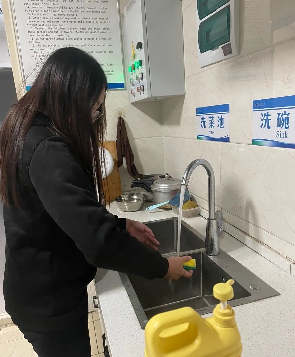 留学生们一大早就行动起来,开窗通风,佩戴口罩、手套擦拭桌面、墙面,清理地面和垃圾,清洗床单衣物等生活用品,整理个人物品,还主动打扫了公共厨房,每个学生都干得热火朝天。