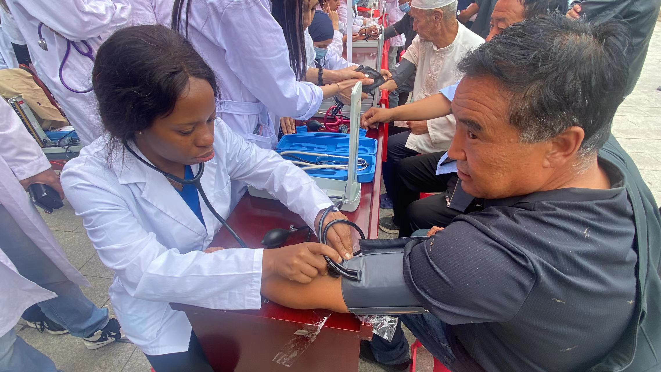 在闽宁镇党群服务中心前,教师们又带领30名临床医学专业留学生开展了义诊活动。大家耐心询问了前来咨询的村民身体情况,解答村民的各种健康问题,还为村民提供了测量血压、口腔检查等医疗服务,受到当地群众的热烈欢迎。