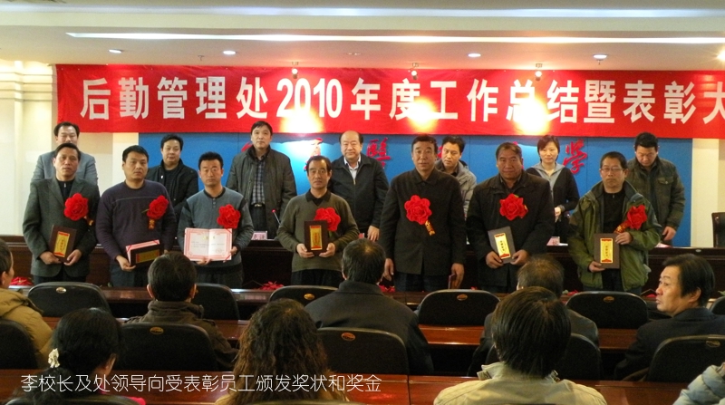 吴克谦党总支书记宣读了《后勤管理处关于2010年终考核表彰的决定》。16名先进个人,10名“十佳员工”荣获表彰,李校长以及处领导为获奖员工颁发了奖状和奖金。获得先进个人及“十佳员工”的代表发言表示将荣誉化作动力,更加努力的工作,为后勤服务保障工作做出新的贡献。