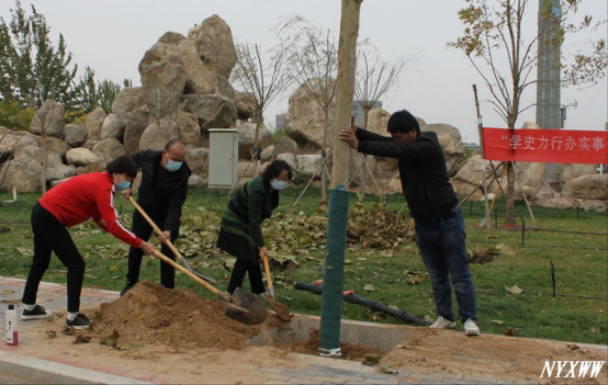 10月14日下午,机关党委与后勤管理处党总支联合举办“学史力行办实事、绿色发展开新局”主题党日活动。校党委副书记牛阳、副校长郝银菊,机关及后勤管理处党员代表在综合教学楼周边栽种100余棵法国梧桐,极大改善校园环境。