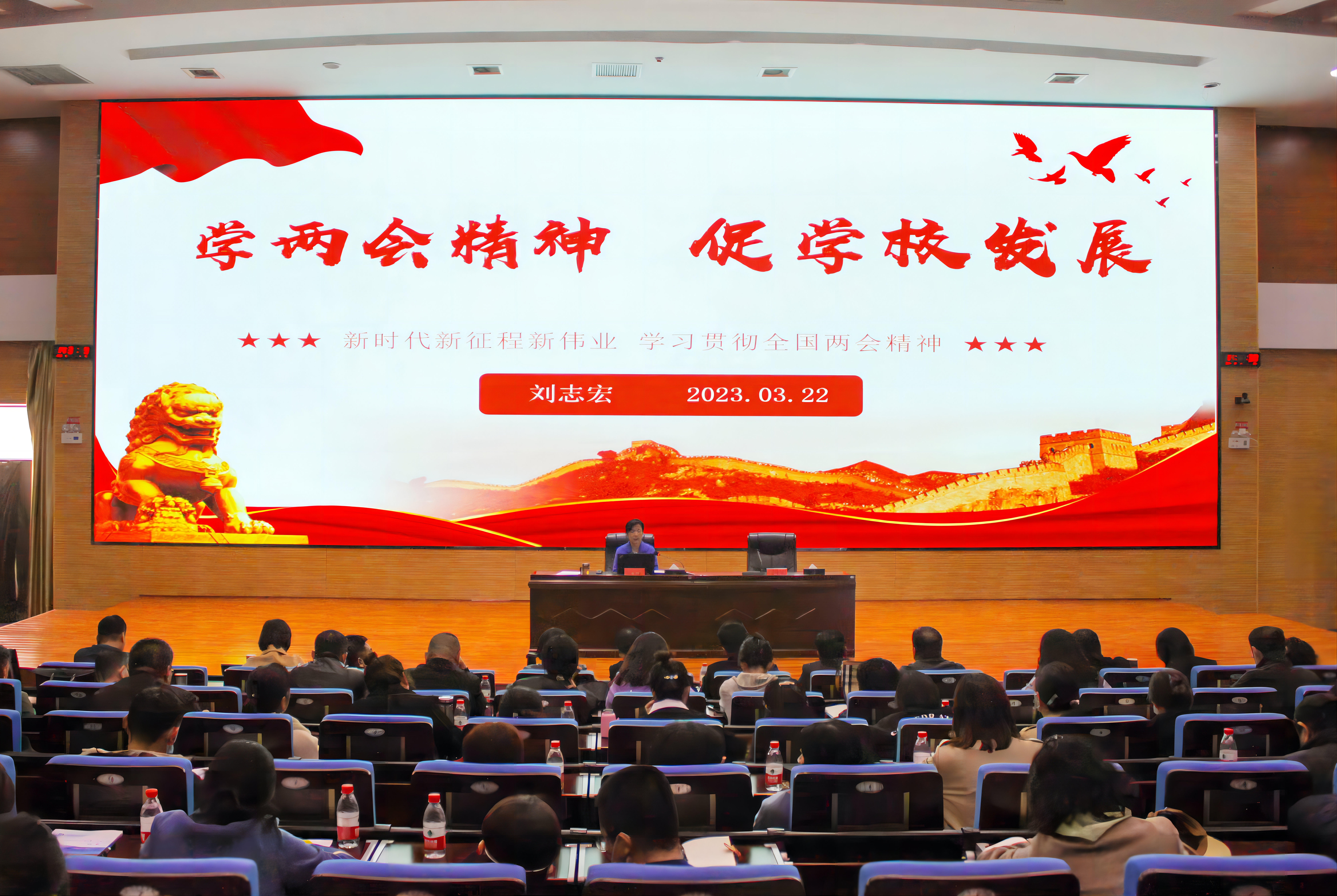 刘志宏以“学两会精神 促学校发展”为主题,对习近平总书记在全国两会期间发表的系列重要讲话精神、两会盛况、国务院机构改革方案、第十四届全国人民代表大会第一次会议决议和中国人民政治协商会议第十四届全国委员会第一次会议政治决议进行详细解读。她讲到,与会师生和服务企业人员要把学习宣传贯彻全国两会精神特别是习近平总书记重要讲话精神作为当前和今后一个时期的重大政治任务。把学习贯彻全国两会精神与推动落实学校年度重点工作任务相结合,与贯彻落实学校综合改革方案相结合,全面贯彻新发展理念,主动融入新发展格局,同心同德、苦干实干,全力推动实现学校高质量发展。