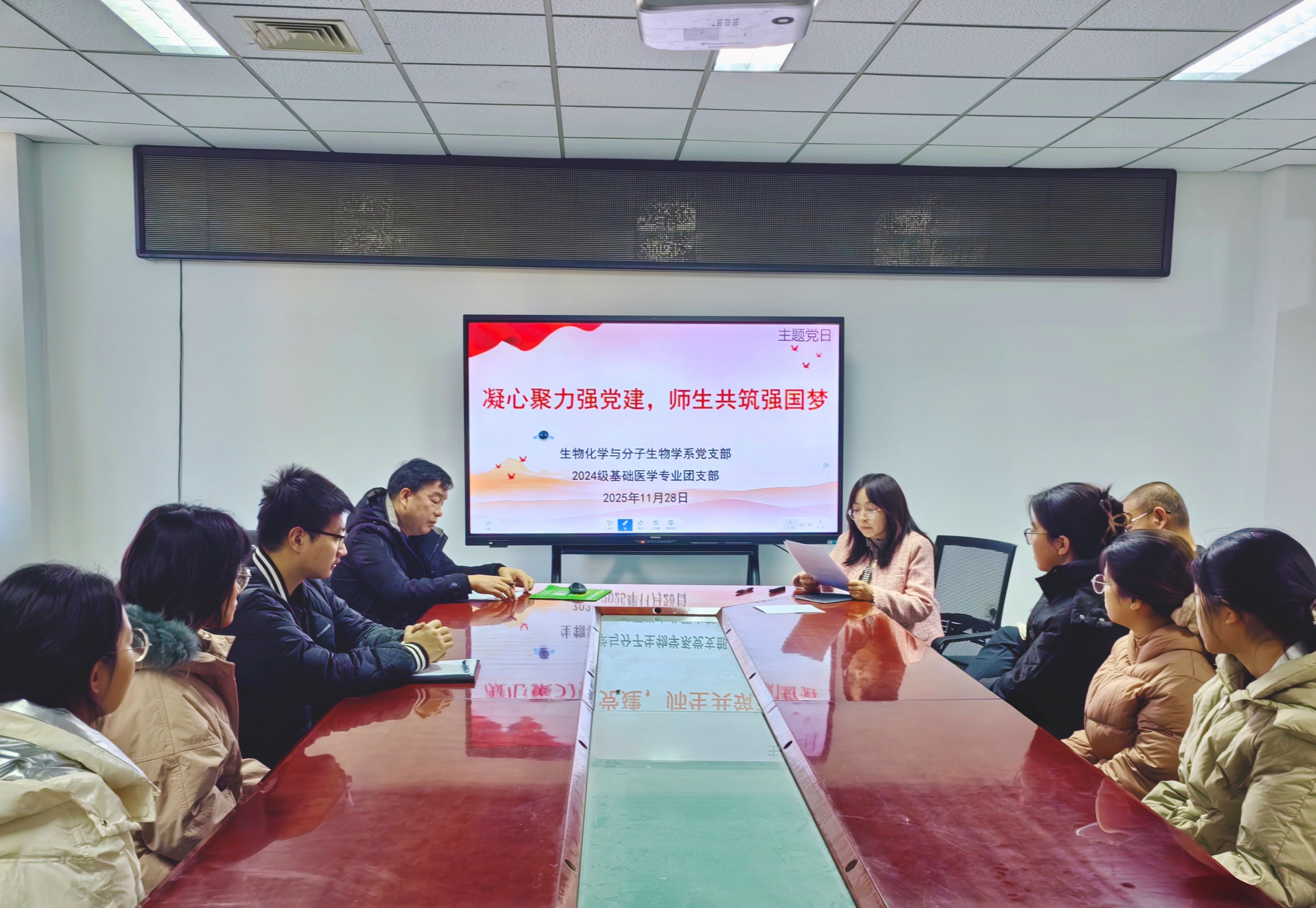 11月28日,基础医学院生物化学与分子生物学系党支部与2024级基础医学创新班团支部在厚生楼320会议室开展“聚焦学情促提升 党建赋能育新人”党建带团建主题党团日。活动中,与会师生集中学习了党的二十届四中全会...