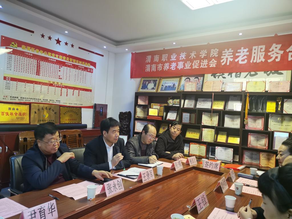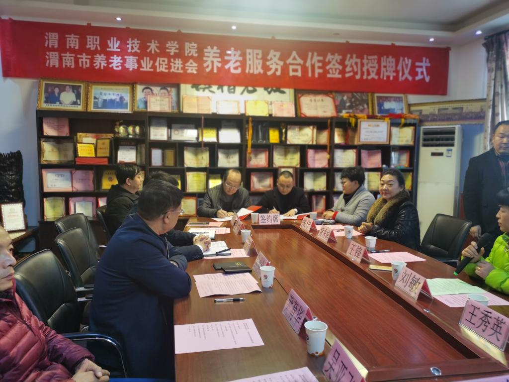 为推动渭南养老服务与管理事业发展,提升我院学生的养老服务能力与素养,12月13日下午,beat365与渭南市养老事业促进会在临渭区老年公寓签订了合作协议,并举行了老年服务与管理专业首个校外实训基地挂牌仪式。渭南市民政局副局长张永创、社会福利科科长杨志宏,渭南市养老事业促进会会长王锋、临渭区老年公寓院长黄秀娟,beat365副校长王录军、对外交流合作处处长尹育华、beat365中文唯一官网院长张成、副院长吴亚飞,老年服务与管理专业带头人任秋爱等出席会议。