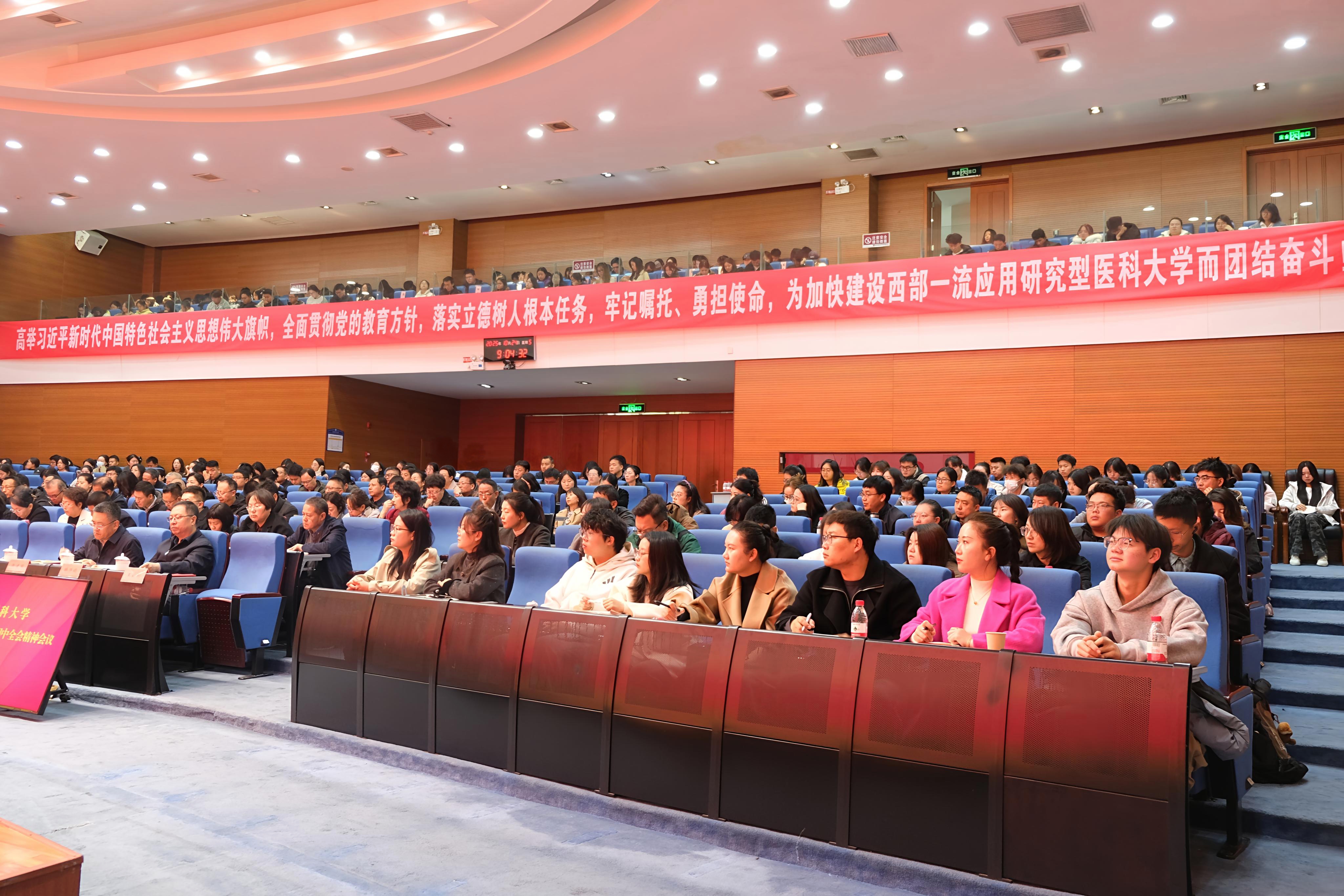 会议要求,学习好、贯彻好全会精神是学校当前和今后一个时期的重大政治任务。全校上下坚持学以铸魂,掀起学习热潮,通过理论学习中心组学习、党支部研学、专题讲座导学、个人自学、宣传助学等多种形式,带动广大党员干部、师生员工及时学、跟进学,进一步深化理解认识、凝聚思想共识。坚持研以致用抓好宣传阐释,组织专家学者开展座谈研讨、研究阐释,推动全会精神有机融入思政课堂。通过校园网、微信公众号等阵地全方位、多角度、深层次地做好全会精神宣传,营造浓厚氛围。坚持学以促干,推动落地见效,聚焦全会明确的主要目标、重点任务,找准与学校高质量发展的结合点、切入点和着力点,主动认领任务、细化落实举措,将全会精神落实到实际工作和岗位职责中,确保在贯彻党的教育方针、推进学科建设、提升人才培养质量、深化综合改革、加强师资队伍建设、增强科研创新能力等方面取得新突破,科学编制好学校“十五五”发展规划,以“赶考”姿态奋力谱写宁医高质量发展新篇章。