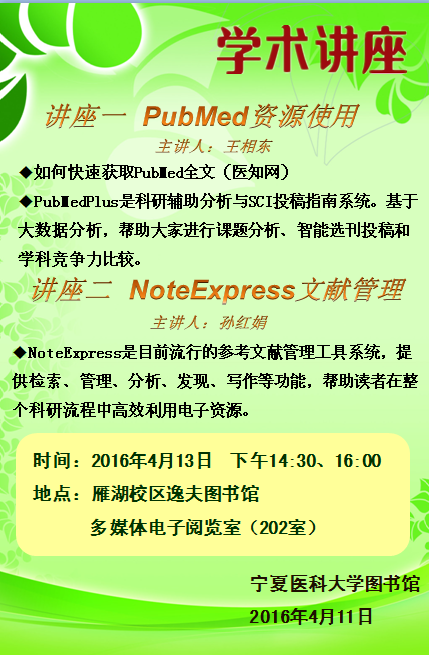 学术讲座:PUBMED资源使用——王相东 NoteExpress文献管理——孙红娟