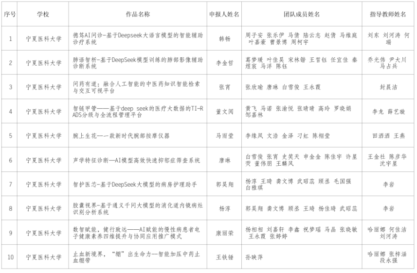 根据第十九届“挑战杯”竞赛“人工智能+”专项赛的通知要求,经参赛队伍自主申报、学校团委初审、自治区团委审核,拟推荐以下11件作品参加第十九届“挑战杯”全国大学生课外学术科技作品竞赛“人工智能+”专项赛。