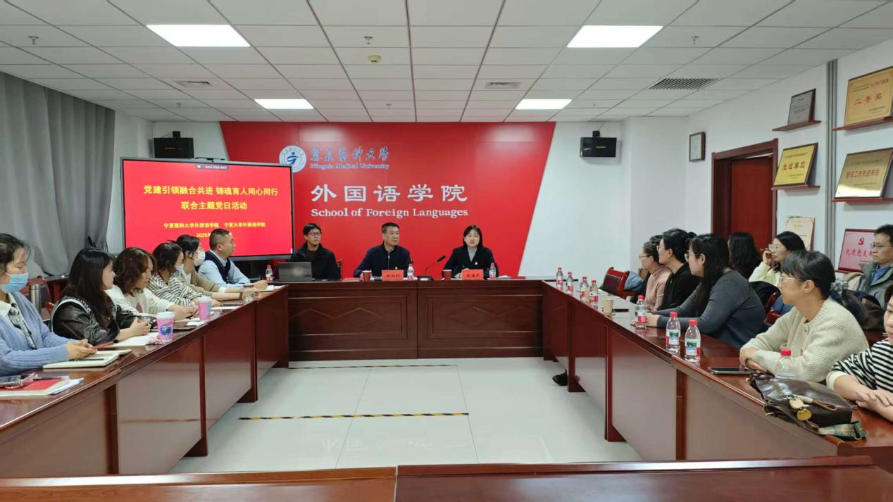 11月26日,学校外国语学院与宁夏大学外国语学院在学校雁湖校区联合开展“党建引领融合共进 铸魂育人同心同行”主题党日。宁夏大学外国语学院党总支书记朱海燕及党员教师代表,十大信誉外国语学院全体班子成员及教工第一、二党支部全体党员参加。